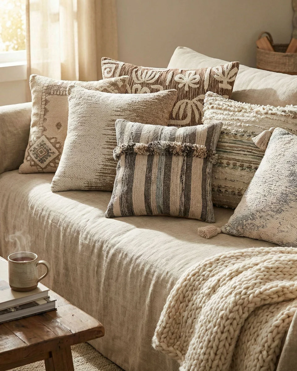 Monochromatic: Single-color cushions with texture variation (premium aesthetic, consistent sellers)
